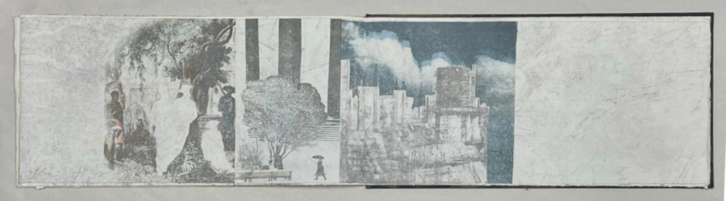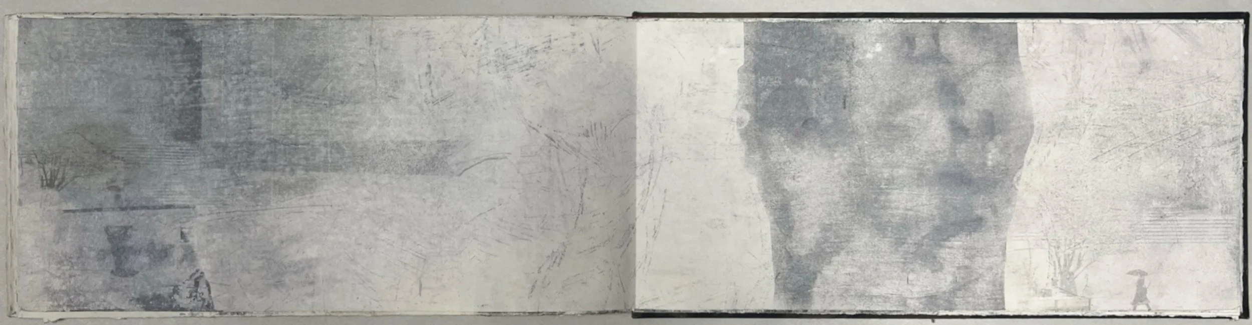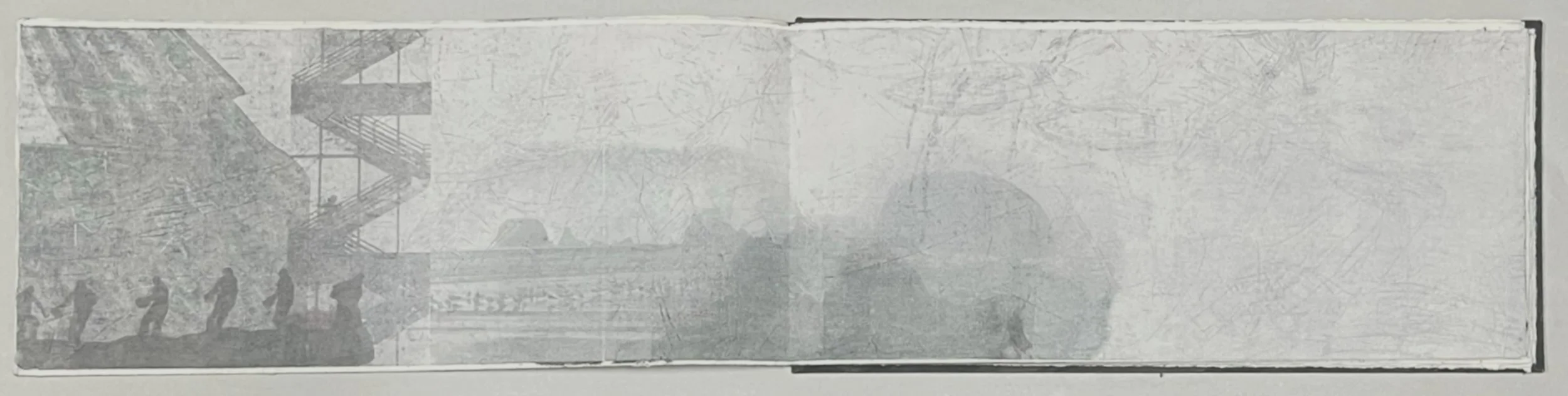 Gardens of Industry, pages from collaborative artist book, Angela Gardner and Gwenn Tasker, solvent release on BFK Rives 250gsm, 2023-2025, each double-spread 75cm w x 20cm l (13pp)