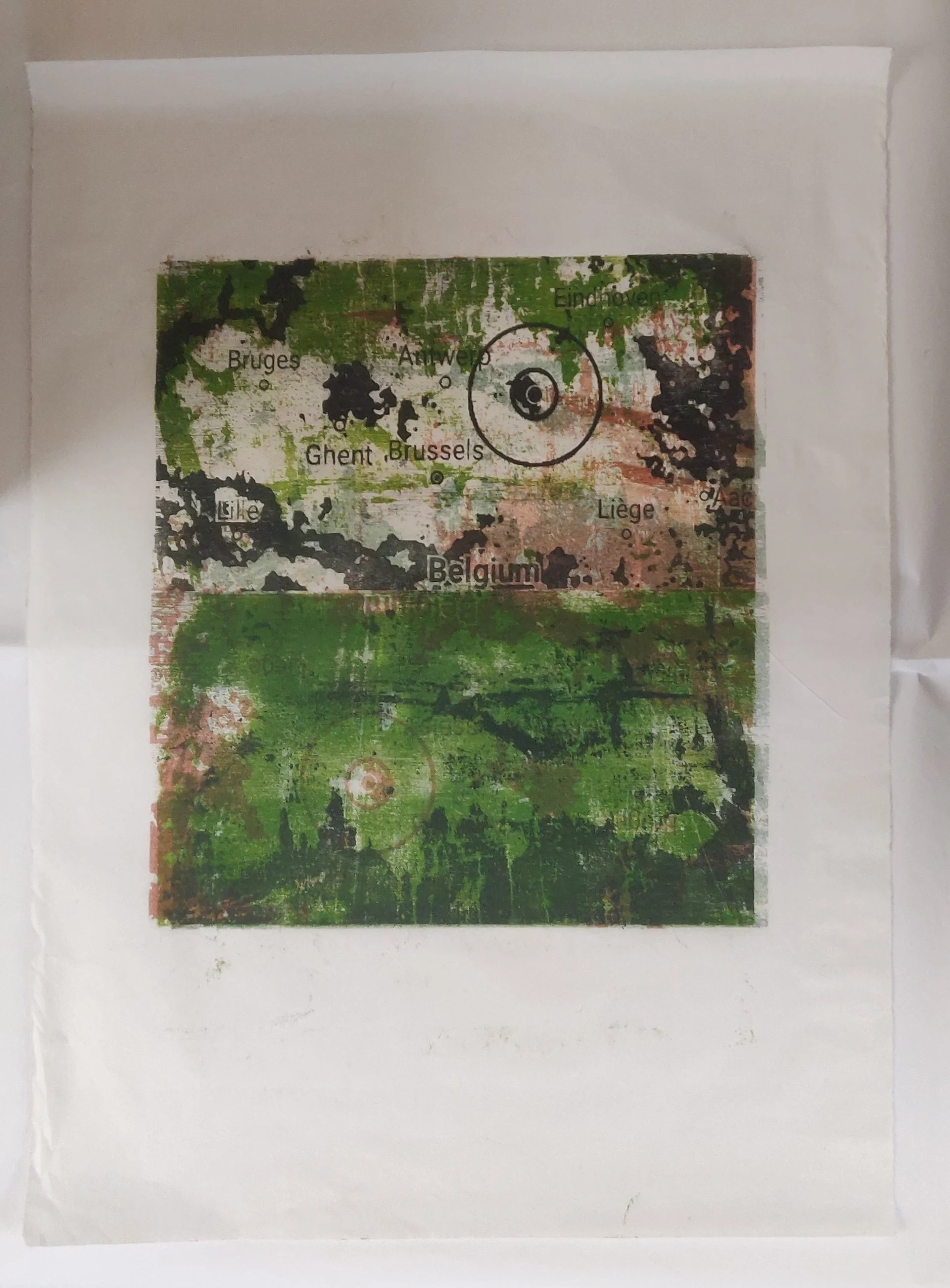 Weather Station – Printed at Cork Printmaker’s Studio, Ireland 2022-3 using laser-cut woodblocks created at Frans Masereel Centrum in 2020. Variations in colour, orientation and layering of blocks are explored as series of monoprints on Japanese paper. I am rarely interested in creating editions using printmaking as a way of experimenting and exploring themes, preferring variation to uniformity. These prints map the weather over Kasterlee during my residency when I was focussed on a climate related series The Weight of Clouds.