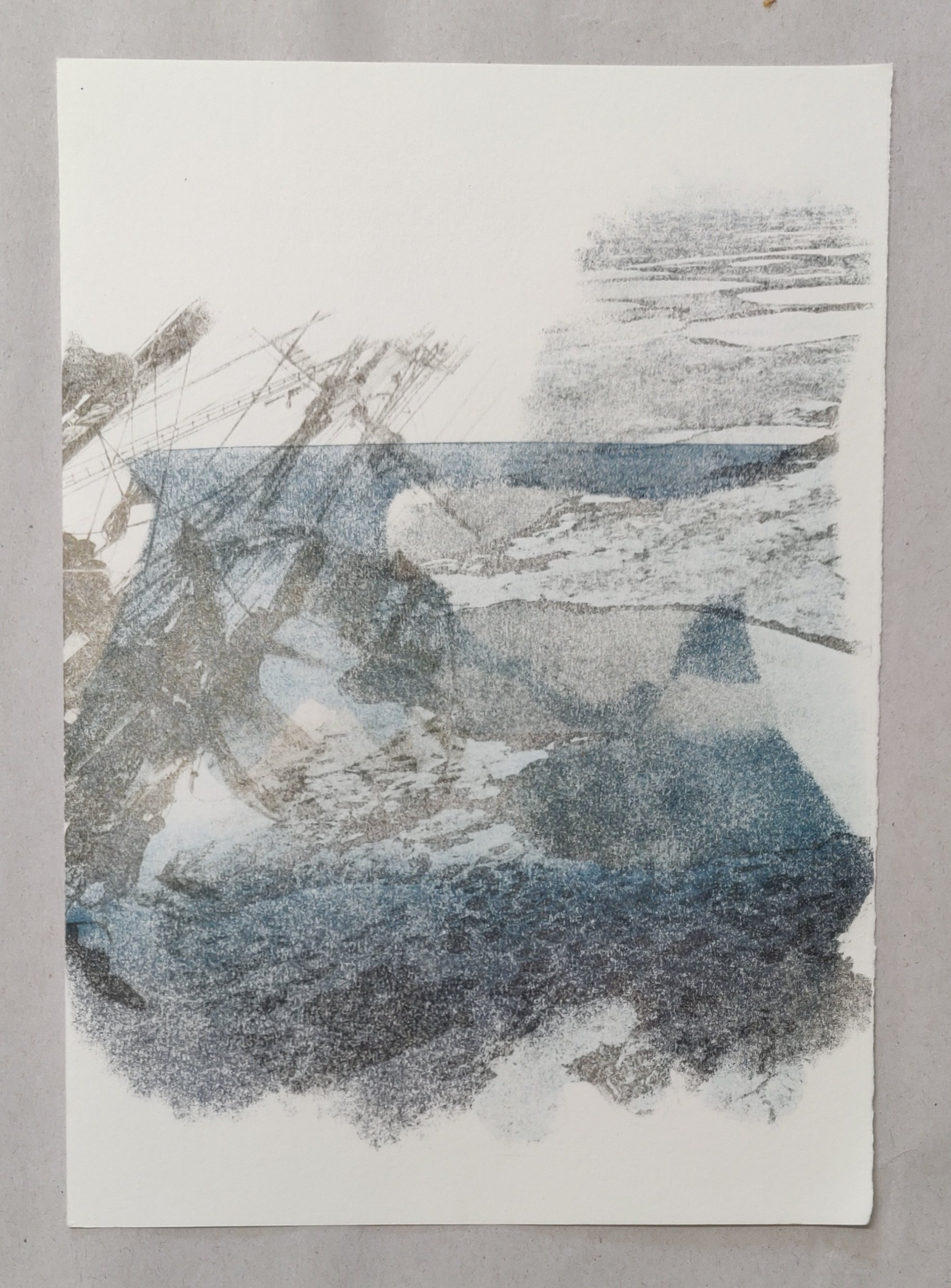 Shift – a series of small solvent release prints printed at Bent Press Studio, Australia 2023. They explore the fragility of the ice landscape of Antarctica through the metaphor of the dissolving of the image by the solvent and the dissolving of the landscape as the ice melts.